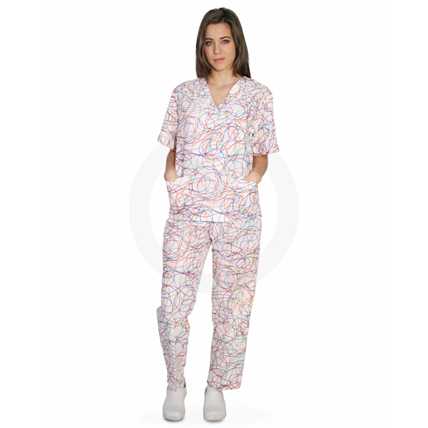 Casaca de escote pico y manga corta rematados ambos con bieses de 5 cm. con pespunte de adorno y tres bolsillos que cubren la parte delantera para hacerlo funcional y practico. Un clásico dado la vuelta por Agatha Ruiz de la Prada.