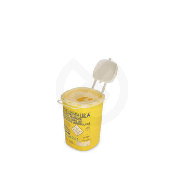 Contenedor de seguridad para agujas y objetos punzantes usados. Capacidad para 0,6 litros.