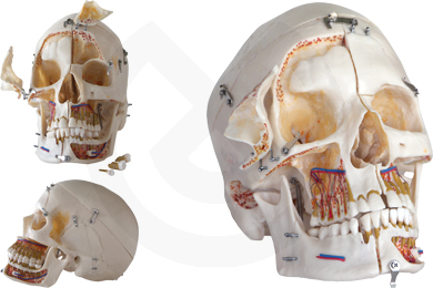 Cráneo de tamaño real, desmontable en 10 partes y coloreado para mostrar las inserciones musculares del aparato masticatorio, terminaciones nerviosas y vasculares Mandíbula articulada. Perfecta reproducción de cavidades nasales,senos,etc.
