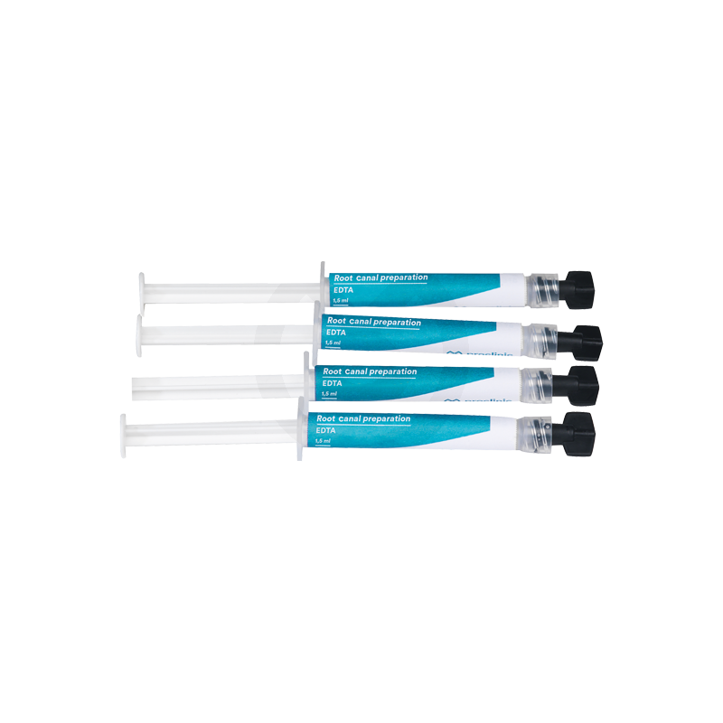 EDTA (ácido tetra acético diamino etileno). Ensanchador de canales radiculares, ayuda a disolver el tejido pulpar y retira la capa de detritus, además, su efecto lubricante hace más fácil el uso de las limas. Permite la eliminación del contenido mineral patológico (pulpitis, calcificaciones…), tiene acción antibacteriana y se elimina fácilmente gracias a su hidrosolubilidad.