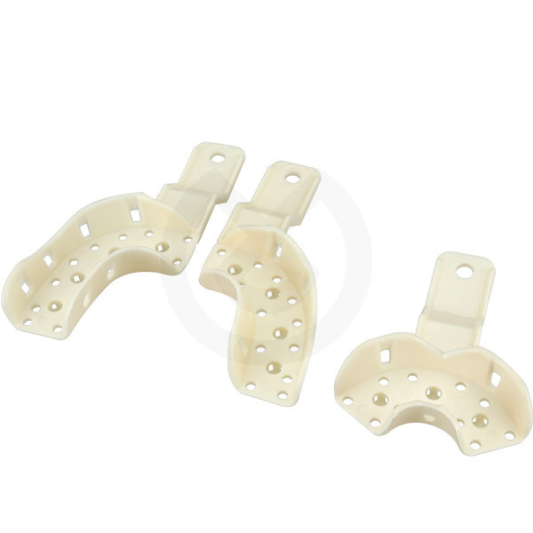 Perforadas. Esterilizables. Termomoldeables.Mango angulado.Cubetas para impresión plásticas durables de poliestireno. Plástico rígido, no se astilla ni se rompe. Retenciones especiales en forma de canasta para aumentar la retención del material de impresión. Mango angulado reforzado para facilitar su posicionamiento. Moldeable en agua caliente o sobre llama. Bordes suaves para mejor confort.