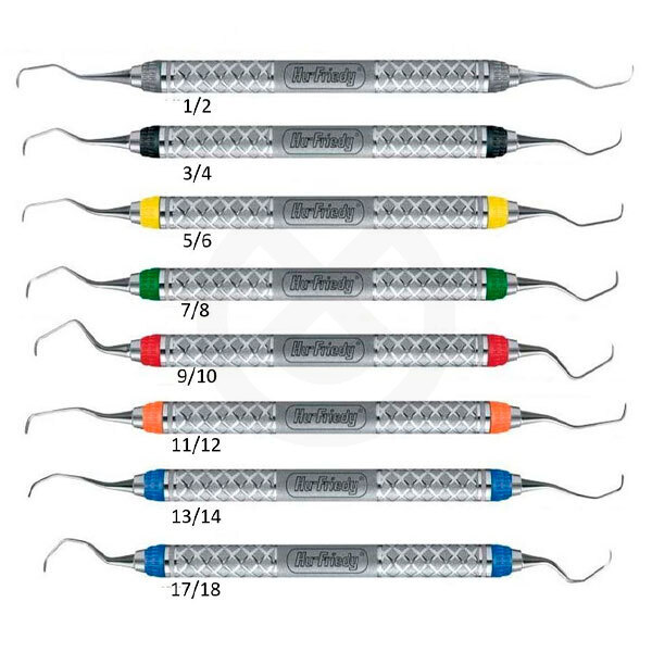 Curetas Gracey Everedge con aros de colores que facilitan su identificación. Gracias a su aleación de acero inoxidable, mantienen el corte durante un 50% más de tiempo.