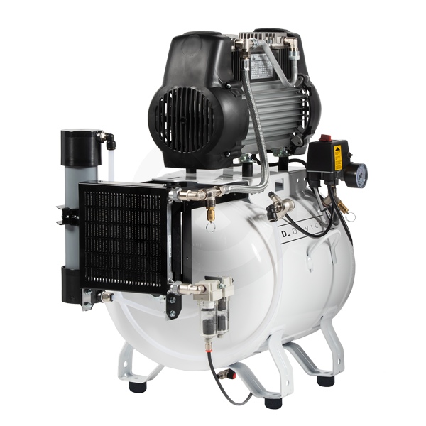 Compresor seco, caudal 120 l/min@5 bar, depósito de 40 l, con secador de membrana y filtración de 0,01 micras.