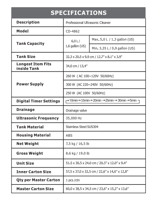 Frequencia: 35,000Hz; Potencia 260W (100-120 vCA; 50/60Hz) 300 W (220-240 Vca; 50/60 hZ) 250 W (100 Vca;50/60 Hz) ; Tank Capacity: 6000 ml; Timer: 1 to 30-minute full range timer; Features: Display de control de temperatura 40 a 60 grados Celsius .