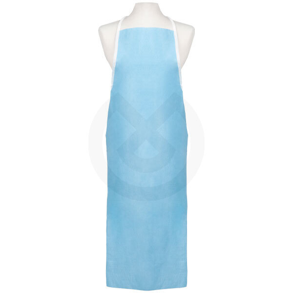 Delantal impermeable fabricado con tela no tejida absorbente impermeable de doble capa. Talla única, en color azul. Ideal para la protección ante el riesgo de salpicaduras de líquidos.