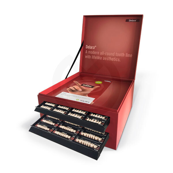 Dos cajones surtido colores A2 y A3 con 48 tablillas de dientes anteriores y 36 tablillas de molares posteriores. (ver detalle en pdf adjunto)