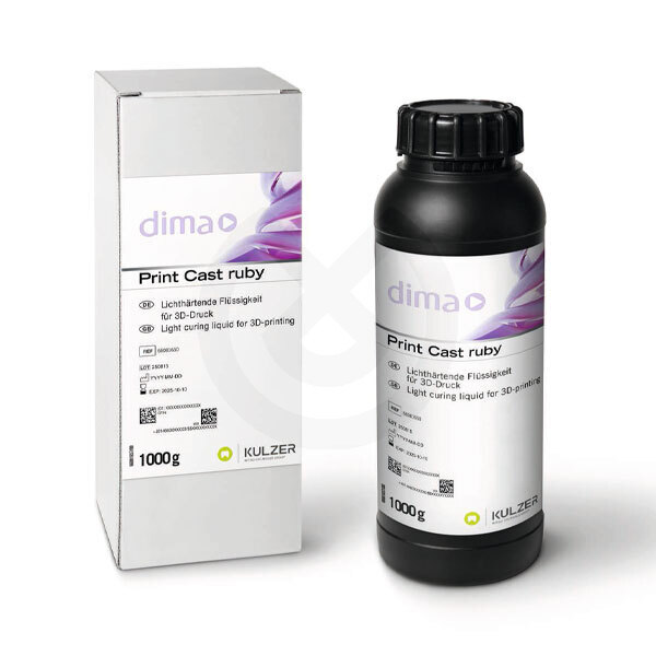 Es una resina de impresión universal para todas las aplicaciones y estructuras calcinables: coronas y puentes (hasta 5 unidades), parciales y cerámica prensada en metales preciosos y no preciosos. No deja residuos. Con dima Print Cast ruby conseguirá líneas de margen muy precisas y afiladas, así como superficies lisas. Fórmula de baja viscosidad para una limpieza más rápida. Color rojo.
