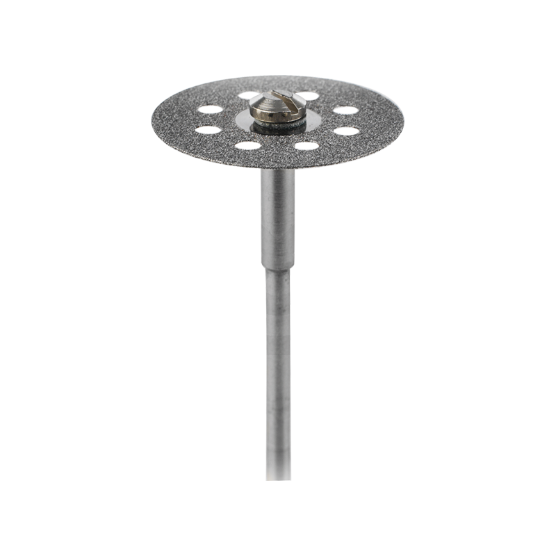 Disco diamantado perforado flexible. Diamantado completo y por los dos lados. Grano fino. Grosor de 0,3mm. 1Disco montado en mandril PM.