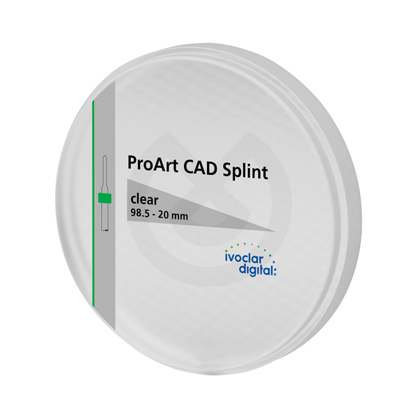ProArt CAD Splint son discos fabricados con un material de PMMA transparente. Se utilizan para producir férulas oclusales, p. ej., para el tratamiento del bruxismo. Con estos discos también pueden obtenerse plantillas de fresado para implantes.
