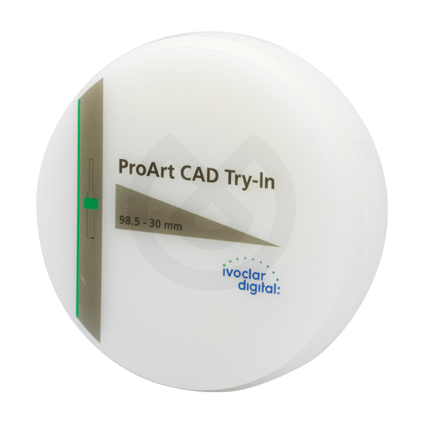 ProArt CAD Try-In es un disco de PMMA de color blanco lechoso utilizado para la fabricación de pruebas de montaje funcionales. Le permite producir la restauración final junto con el paciente de acuerdo con sus ideas y con la mayor exactitud de ajuste posible, p. ej., durante la producción de prótesis digitales o puentes sobre implantes. Los discos también pueden utilizarse para la producción digital de cubetas de impresión y cubetas funcionales.