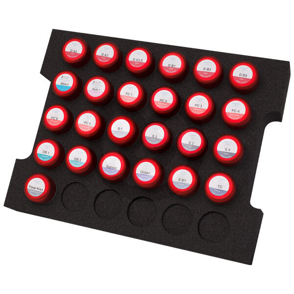 Contenidos: 6x 3 ml Opaquer en pasta A2, A3, A3.5, B1, B3, D3 1x 3 ml Pasta neutra 6x 20 g Dentina D A2, A3, A3.5, B1, B3, D3 6x 20 g Power Chroma PC1 - PC6 4x 20 g Incisal S1 - S4 2x 20 g Incisal Opal OS 1+2 2x 20 g Opal Effect OE Sunset + OE Ocean 3x 20 g Stand by & Transpa & Corrector Final Kiss 1x 5 g DS Universal pasta de glasear 1x 20 g NE-Bonder 1x 3 ml Líquido opaquer pasta 1x 50 ml Líquido modelar SD 1x 15 ml Líquido modelar Form 2x 5 ml DS Maquillaje Universal Incisal i1 & Body Maquillaje S2 1x 15 ml Líquido DS Maquillajes Universales 2x Pinceles Pinelo opaquer & maquillaje 2x Puntas Pinelo No. 0 & No. 8 1x Medidor 2x Guía de colores Starter Power & Starter Base+Opal Instrucciones de trabajo / toallita / esponja Rueda de color Kiss