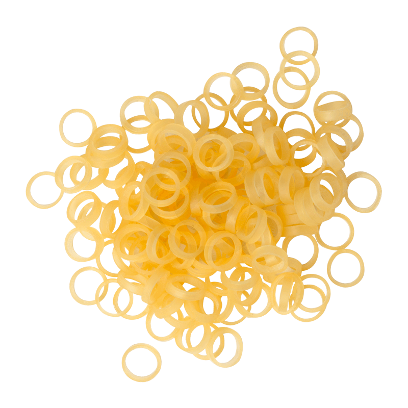 Elásticos especialmente para pacientes alérgicos a látex. Total de 1.000 elásticos presentados en 10 bolsitas de 100. La fuerza indicada es la fuerza ejercida cuando el elástico es alargado 3 veces su diámetro