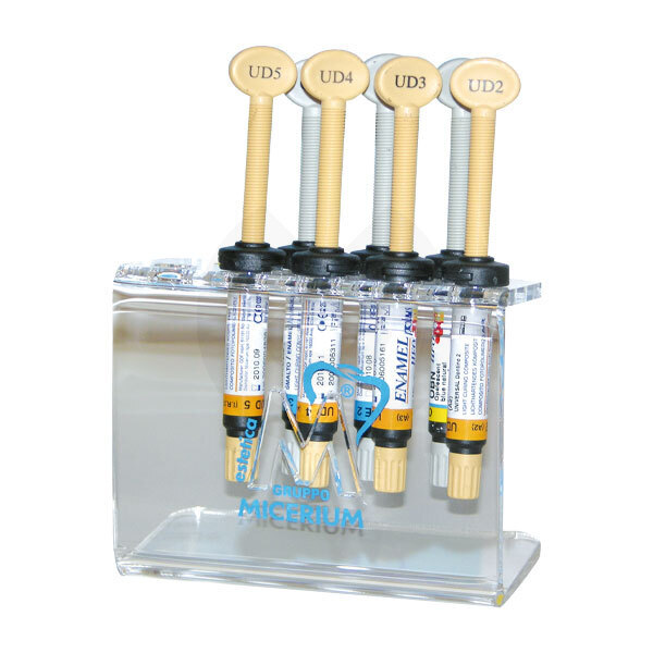 7 jeringas de 2,5 g (4 dentinas: UD2 (A2), UD3 (A3), UD4 (A4), UD5 + 2 esmaltes genéricos: GE2 y GE3 + 1 esmalte opalescente OBN + soporte en plexiglás + Shny A, B, C con cepillo y fieltro + 5 EnaPost 2% - 1 mm con fresa + 1 EnaBond 2,5 ml + EnaEtch etching gel 2 ml