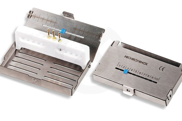 Para 12 instrumentos. Para poner en ultrasonidos. Con indicador de silicona de número de esterilizaciones realizadas.Endo Pro Sterimeter Nichrominox Es el producto que une las ventajas de un dispensador de instrumentos de endodoncia con la de los cassettes para esterilizar esta instrumentación. Especialmente concebido para el almacenaje de los instrumentos de Niquel-Titanio cuando está cerrado es un cassette. Cuando se abre el soporte interno de teflón queda verticalmente presentando las limas. Una vez utilizadas son colocadas de nuevo en sus agujeros. Totalmente de acero inoxidable y teflón resiste cualquier tipo de descontaminación y esterilización. Endo Pro además de una regla graduada para la medición de la longitud incorpora el sterimeter: una ranura numerada con un marcador de silicona que le permitirá controlar y visualizar el número de esterilizaciones a que ha sido sometido el instrumental.