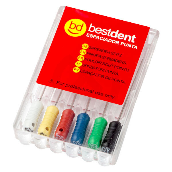 Espaciadores en punta para la condensación lateral y vertical de guttapercha. Fabricados en acero inoxidable.