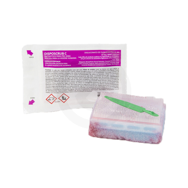 Esponja antiséptica con cepillo y limpiauñas para la limpieza quirúrgica de las manos. Estéril y desechable. Impregnada en solución antiséptica (20 ml. aprox.) de digluconato de clorhexidina al 4%. Medidas: 8,8 x 4,5 x 4,0 cm.