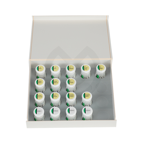 - 12 x Lusters 10g: LT0, LT1, T Blue, LT Natural, Creamy Enamel, Sun Bright, Incisal Aureola, Creamy White, Aqua Blue 1 y 2, LT Yellow, LT Super Gray.