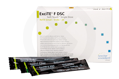 Excite F DSC (Dual cure Single Component) es un adhesivo de polimerización dual con liberación de fluoruro utilizado en combinación con la técnica de grabado total. Ha sido diseñado para casos clínicos donde la luz no se puede utilizar para polimerizar (por ejemplo en la cementación de postes endodónticos o restauraciones indirectas) o en el que composites de polimerización química son empleados. • Simple, el sistema de un solo paso con el patentado cepillo de aplicación del iniciador. • No se requiere de luz para la polimerización si se utiliza un composite dual o autopolimerizable o un cemento composite. • Liberación de flúor. • Higiénicas monodosis con aplicadores en dos tamaños, Regular para preparaciones normales y Small/Endo para micro cavidades.