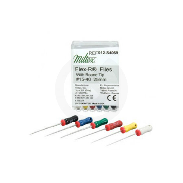 Miltex Limas Flex R son limas manuales de sección triangular diseñadas con puntas no cortantes. Miltex Flex R están hechas de acero inoxidable de alta calidad, las limas Flex R garantizan la limpieza más completa y conformación del conducto radicular. La sección triangular ha sido diseñada para proporcionar máxima flexibilidad a la lima.