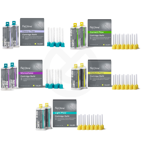 - Flexitime Heavy Tray: Material de auto mezcla para cubetas con consistencia similar a la masilla (Putty). Alta dureza final.