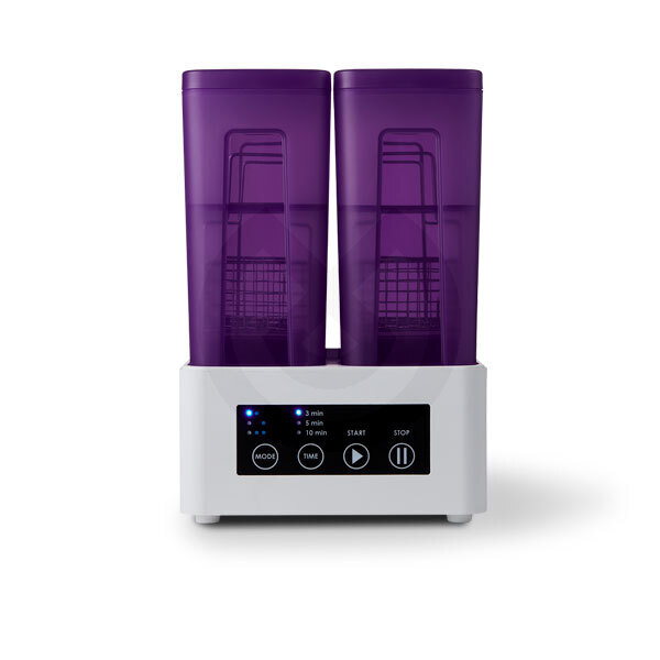 Cleani está diseñado con tanques dobles para un proceso de limpieza de dos etapas que permite lavados intensos y finos. Con un flujo de trabajo que es tres veces más rápido, Cleani consume un 50% menos de alcohol que un lavado manual y elimina eficazmente el 90% de las resinas sin curar de las impresiones.