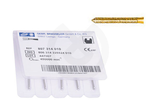 Serie 2000 Grano 170 µm.Tallado rápido.Fresas realizadas en diamante super grueso de 180mc. para el tallado rápido. La especial Técnica de selección del grano de diamante y de la unión de este al mandril, exclusivo de Komet, aseguran un tallado super rápido con excelente refrigeración y superficies homogéneas de fácil y rápido pulido.Presentación en envase de 5u. para Turbina. Color dorado y anillo verde para su rápida identificación.