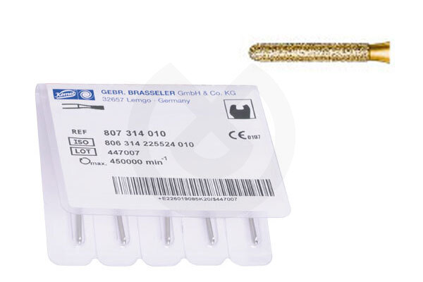 Serie 2000 Grano 170 µm.Tallado rápido.Fresas realizadas en diamante super grueso de 180mc. para el tallado rápido. La especial Técnica de selección del grano de diamante y de la unión de este al mandril, exclusivo de Komet, aseguran un tallado super rápido con excelente refrigeración y superficies homogéneas de fácil y rápido pulido.Presentación en envase de 5u. para Turbina. Color dorado y anillo verde para su rápida identificación.
