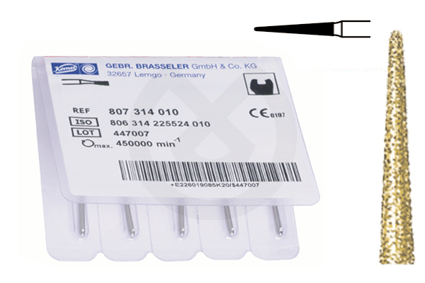 Serie 2000 Grano 170 µm.Tallado rápido.Fresas realizadas en diamante super grueso de 180mc. para el tallado rápido. La especial Técnica de selección del grano de diamante y de la unión de este al mandril, exclusivo de Komet, aseguran un tallado super rápido con excelente refrigeración y superficies homogéneas de fácil y rápido pulido.Presentación en envase de 5u. para Turbina. Color dorado y anillo verde para su rápida identificación.