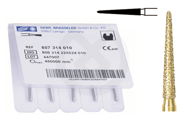 Serie 2000 Grano 170 µm.Tallado rápido.Fresas realizadas en diamante super grueso de 180mc. para el tallado rápido. La especial Técnica de selección del grano de diamante y de la unión de este al mandril, exclusivo de Komet, aseguran un tallado super rápido con excelente refrigeración y superficies homogéneas de fácil y rápido pulido.Presentación en envase de 5u. para Turbina. Color dorado y anillo verde para su rápida identificación.