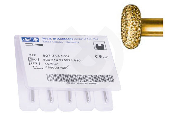 Serie 2000 Grano 170 µm.Tallado rápido.Fresas realizadas en diamante super grueso de 180mc. para el tallado rápido. La especial Técnica de selección del grano de diamante y de la unión de este al mandril, exclusivo de Komet, aseguran un tallado super rápido con excelente refrigeración y superficies homogéneas de fácil y rápido pulido.Presentación en envase de 5u. para Turbina. Color dorado y anillo verde para su rápida identificación.