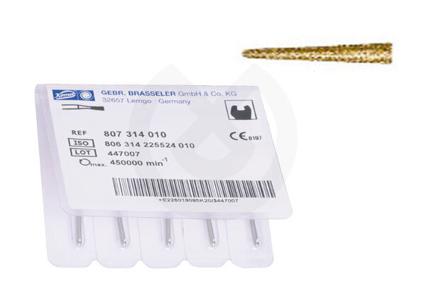 Serie 2000 Grano 170 µm.Tallado rápido.Fresas realizadas en diamante super grueso de 180mc. para el tallado rápido. La especial Técnica de selección del grano de diamante y de la unión de este al mandril, exclusivo de Komet, aseguran un tallado super rápido con excelente refrigeración y superficies homogéneas de fácil y rápido pulido.Presentación en envase de 5u. para Turbina. Color dorado y anillo verde para su rápida identificación.