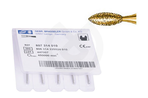Serie 2000 Grano 170 µm.Tallado rápido.Fresas realizadas en diamante super grueso de 180mc. para el tallado rápido. La especial Técnica de selección del grano de diamante y de la unión de este al mandril, exclusivo de Komet, aseguran un tallado super rápido con excelente refrigeración y superficies homogéneas de fácil y rápido pulido.Presentación en envase de 5u. para Turbina. Color dorado y anillo verde para su rápida identificación.