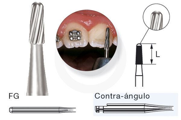 Fresas para quitar residuos de la parte labial/vestibular. Para la eliminación de los restos de adhesivos, una vez se han retirado brackets o bandas. Son instrumentos diamantados y de carburo de tungsteno para la eliminación de los restos de adhesivos, una vez acabado el tratamiento ortodóntico con brackets y bandas, sin dañar el esmalte. Gracias a su dentadura especial, estas fresas quitan los residuos de adhesivo, de una manera suave sin dañar el esmalte después del tratamiento ortodóntico. Sus filos espirales son especialmente apropiados para quitar materiales blando s de una forma precisa y rápida. Estas fresas se usan con poca presión, lo que cual permite eliminar capas muy finas, con mínima generación de calor. Están provistas de puntas sin cortes para no dañar la encía y de u n bisel de seguridad para eliminar la formación de ranuras. Para uso con turbina (FG).