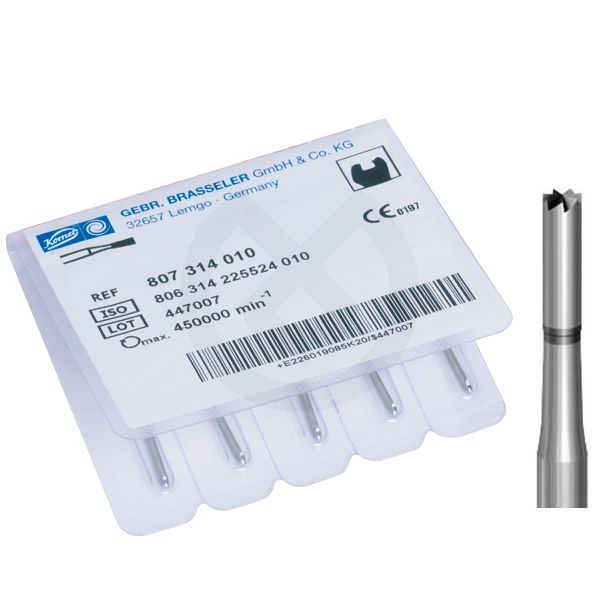 Fresa con borde final cortante para reducir la sustancia ósea durante una prolongación quirúrgica de la corona, para restablecer la anchura biológica o para crear un fondo plano en la cavidad, marcado láser a 4 mm.