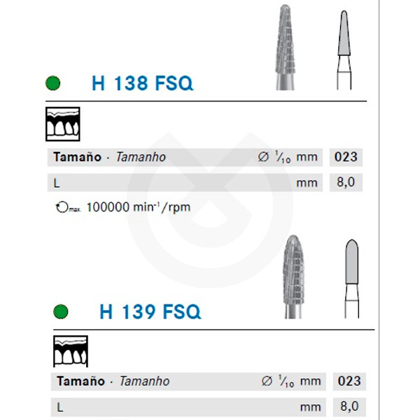 Las fresas con corte FSQ tiene una dentadura fina de corte transversal de alta eficacia. Han sido desarrollada para las zonas de transición metal/rebases blandos, así como para acrílicos elásticos o muy duros. El corte transversal de esta dentadura divide los filos del instrumento en segmentos más pequeños.