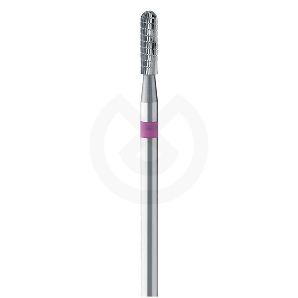 Fresa de tungsteno con corte especial en cuadrícula, indicada para un fresado controlado en resinas, acrílicos y metales no preciosos. Su forma cilíndrica redondeada ofrece un acabado regular y preciso en superficies planas o contorneadas. Anillo rosa: abrasividad extrafina, ideal para acabados muy delicados en micromotor. Velocidad recomendada entre 20.000 - 35.000 rpm.