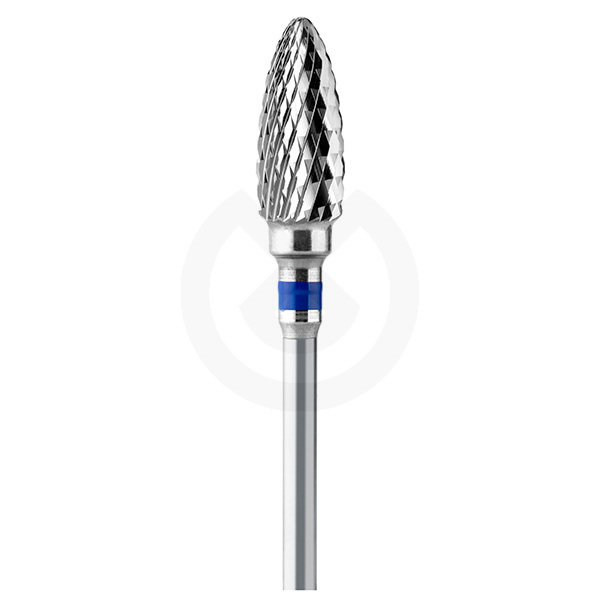Fresa de tungsteno de corte cruzado, ideal para desbaste eficaz de resinas, acrílicos y metales no preciosos. Forma ovoide para trabajos de contorneado suave y superficies curvas. Anillo azul: abrasividad media, uso en micromotor. Velocidad recomendada entre 15.000 - 20.000 rpm.