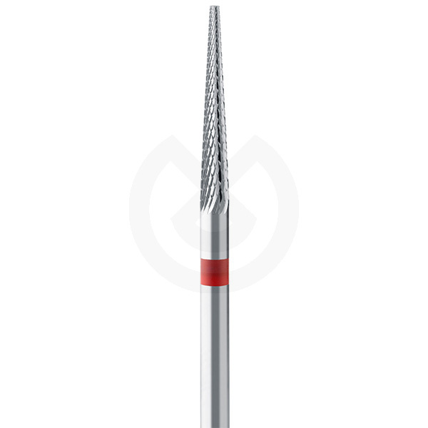 Fresa de tungsteno de corte cruzado fino, indicada para acabados delicados en resinas, acrílicos y metales no preciosos. Su forma cónica larga permite acceder a zonas profundas y estrechas con gran precisión. Anillo rojo: abrasividad fina, recomendada para trabajos de acabado controlado en micromotor. Velocidad recomendada entre 20.000 - 30.000 rpm.