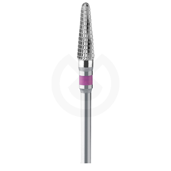 Fresa de tungsteno con geometría de corte cuadriculado, diseñada para acabados extrafinos en resinas, acrílicos y metales no preciosos. Su forma cónica estrecha permite un contorneado suave y preciso en zonas de difícil acceso. Anillo rosa: abrasividad extrafina, ideal para trabajos de acabado delicado en micromotor. Velocidad recomendada entre 20.000 - 35.000 rpm.