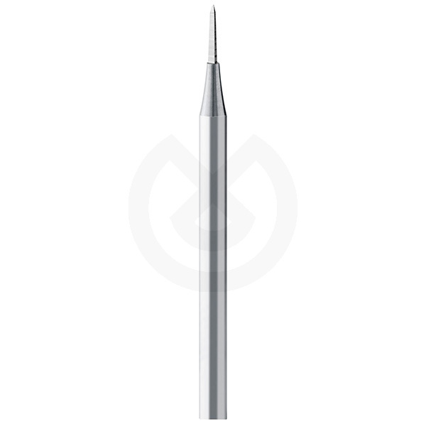 Fresa de tungsteno de punta fina y afilada, indicada para cortes de precisión, ranurado y definición de detalles en resinas, acrílicos y metales no preciosos. Su geometría estilizada tipo lanceta permite un acceso exacto a zonas muy reducidas. Sin anillo de abrasividad: corte directo, ideal para micromotor en trabajos de precisión. Velocidad recomendada entre 25.000 - 45.000 rpm.