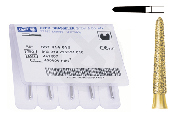 Serie 2000 Grano 170 µm.Tallado rápido.Fresas realizadas en diamante super grueso de 180mc. para el tallado rápido. La especial Técnica de selección del grano de diamante y de la unión de este al mandril, exclusivo de Komet, aseguran un tallado super rápido con excelente refrigeración y superficies homogéneas de fácil y rápido pulido.Presentación en envase de 5u. para Turbina. Color dorado y anillo verde para su rápida identificación.