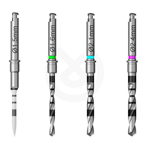 Fresa para mini-implantes Locator. Siga la secuencia de fresado para hueso blando, tipo D2/D3/D4, antes de seguir la secuencia para hueso duro, tipo D1. Esto permite adaptar el protocolo de fresado a la calidad del hueso del paciente. Para hueso de densidad tipo D1, se puede utilizar opcionalmente una fresa cortical como paso final de la secuencia de fresado, en implantes de 3.5, 3.9mm.