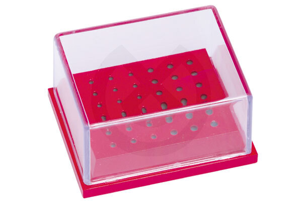 Color rojo.Freseros fabricados en aluminio coloreado que permite su esterilización por cualquier medio. Las tapas, transparentes, son esterilizables para medios químicos en frio. El peso de la base impide los deslizamientos involuntarios.