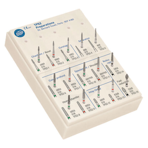 Set de fresas TPS2 diseñado por el Dr. Bernard Touati para la preparación de cavidades para inlays/onlays, coronas y puentes. Para F.G.