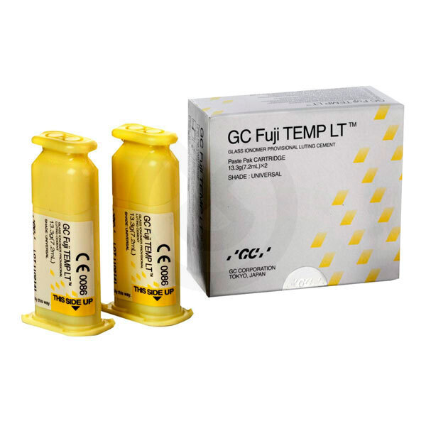 Cemento provisional de ionómero de vidrio en formato pasta- pasta. GC Fuji TEMP LT está especialmente diseñado para la cementación provisional de larga duración. Gracias a su formulación equilibrada, durante la aplicación proporciona una estable retención, mientras que nos asegura la fácil eliminación de futuras restauraciones indirectas. Consistencia no demasiado fluida con bajo espesor de capa. Fácil de eliminar los excesos y de limpiar. Seguridad a largo plazo. Ninguna influencia negativa a la cementación final. Ideal para: Cementación provisional de todos los tipos de cerámica sin metal, resina, acrílico y coronas y puentes de base metálica. Especialmente adaptado para asegurar la retención suficiente (durante el tiempo provisional) y fácil eliminación de coronas y puentes cementados sobre pilares de implantes.