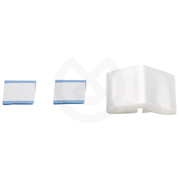 Fundas desechables en polietileno transparente antireflectante con el extremo abierto. Cuentan con dos bandas adhesivas celestes o blancas para fijar los extremos.