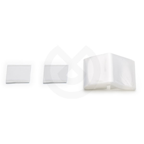 Fundas desechables en polietileno transparente antireflectante con el extremo abierto. Cuentan con dos bandas adhesivas celestes o blancas para fijar los extremos.