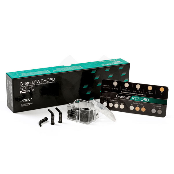 G-ænial® A'CHORD es un composite universal versátil para restauraciones en anterior y posterior, con un sistema de colores simplificado que logra la estética de los 16 colores clásicos Vita con sus 5 colores básicos (core).