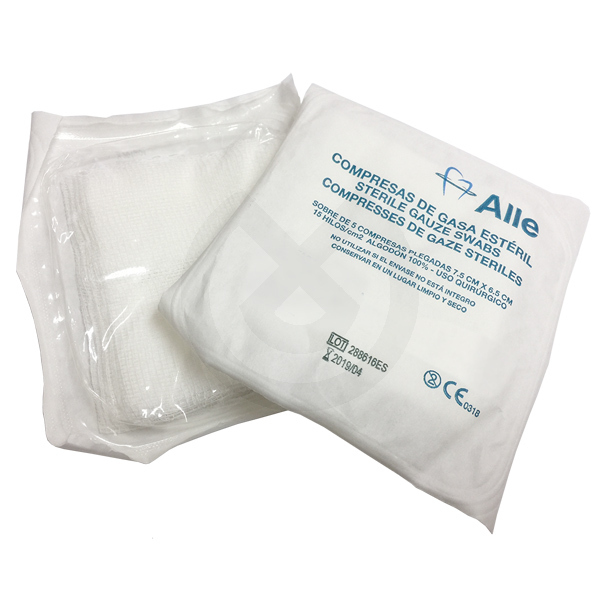 Gasas de algodón 100% hidrófilo de 15 hilos y 8 pliegues con textura rectilínea. Para uso quirúrgico en la cura de la piel lesionada.