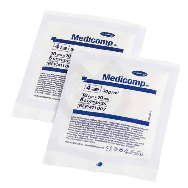Gasas con gran absorción, suaves y finas, la alternativa perfecta a las clásicas gasas de algodón. Su composición es de 70% viscosa y 30% poliéster le proporcionan una estructura parecida a las compresas de algodón y las hace un producto especialmente absorbente, suave y transpirable. Medicomp se usa y aplica como una compresa de algodón, pero con más absorción que una gasa convencional.